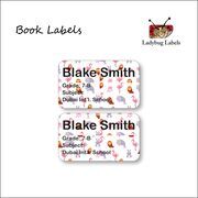 Book labels have traditionally been known as bookplates, however bookplates are usually a little bit more fancy and not only bear the owner's name but also things such as the owner's motto, crest, coat of arms or badge. After the inscription of the owner's name on a custom bookplate it was usually followed by the words "from the library of...", or in Latin, "ex libris". Simple typographical bookplates are termed "book labels”. We’ve gone with simple (with additional options of dinos, ice creams, cup cakes, unicorns, pussy cats and many many more designs to choose from).