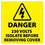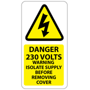 Self-Adhesive Danger 230 Volts Isolate Supply Labels printed yellow & black on gloss white permanent vinyl & laminated for additional durability. Suitable for both internal & external use. Labels measure 33x63mm & are supplied in packs of 100.