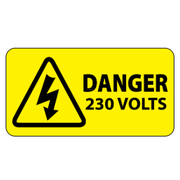Self-Adhesive Danger 230 Volts Labels printed yellow & black on gloss white permanent vinyl & laminated for additional durability. Suitable for both internal and external use. Labels measure 50x25mm & are supplied in packs of 100.