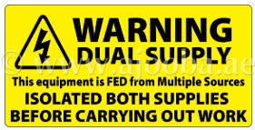 Self-Adhesive Warning Dual Supply Isolate Both Supplies Labels printed black on gloss yellow permanent vinyl & laminated for additional durability. Suitable for both internal & external use. Labels measure 100x50mm & are supplied in packs of 25.