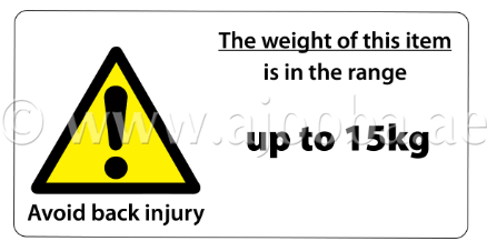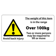 Self-Adhesive Heavy Duty Weight Limit up to 15kg Labels printed black and yellow on gloss white permanent vinyl and laminated. Labels measure 100x50mm and supplied in packs of 25.