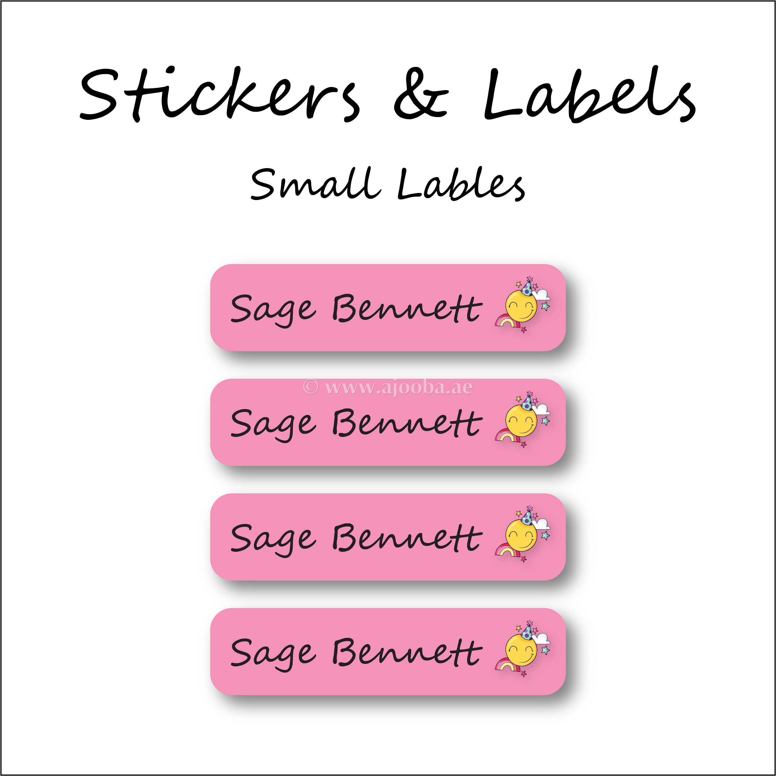 Ajooba Labels is here to stop your trips to the lost and found and to save you money from replacing lost items with our Pink Smiley theme Name Labels! These kid name labels will keep your child’s belongings organized, accounted for, and personalized. Our durable name stickers are perfect for everything that leaves the house with your child.